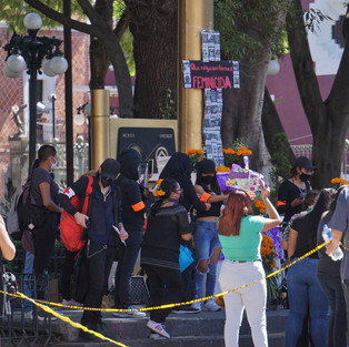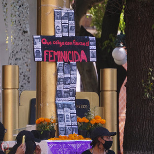 Los descontentos sociales no pararon (quizá aumentaron), más bien cambiaron, se reconfiguraron. Tal es el caso de la movilización que tuvo lugar el sábado 31 de octubre, donde un grupo de personas, portando tapabocas y vestidas de negro, con motivos morados y verdes, salieron a rendir ofrenda ante un altar donde sobre una cruz,se lee la frase “Que caiga con fuerza el FEMINICIDA”.