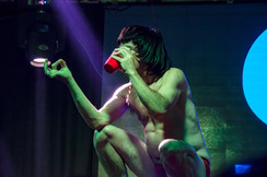 Saltos, insultos y provocaciones al público se mezclan con un striptease secuencial que incendia el show y complementa el performance.